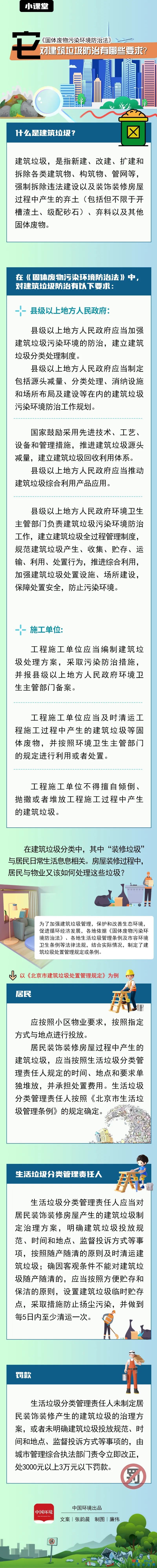 核心提示:重溫新固廢法 l 建筑垃圾處置有這些明確規(guī)定 中國環(huán)境 關(guān)注 2024-06-08 18:03 上海 來源:澎湃新聞·澎湃號·媒體 字號 第三輪第二批中央生態(tài)環(huán)境保護督察近日集中通報了7個典型案例,而這次督察組將目光鎖定在了城市建筑垃圾的處理問題。記者注意到,此次被督察的省(市)均存在建筑垃圾管理粗放、混堆亂倒問題。 那么,在日常生產(chǎn)生活中,建筑垃圾具體包括哪些?在法律條文中又是如何規(guī)定的?不同地域?qū)τ诮ㄖ氖占幚碛心男┮螅? 新固廢法中有哪些要求? 建筑垃圾,是