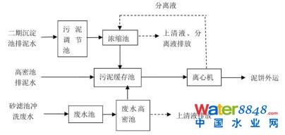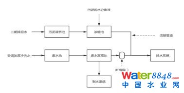 南市水廠一期、二期砂濾池反沖洗水經(jīng)廢水池調(diào)蓄后,通過廢水高密池處理,上清液進(jìn)行排放。二期排泥水經(jīng)污泥調(diào)節(jié)池調(diào)蓄后,通過污泥濃縮池處理,與污泥脫水分離液混合進(jìn)行排放。為達(dá)到節(jié)水減排的目的,廠內(nèi)通過管道改接和增加閥門,將廢水高密池上清液與新建濃縮池上清液分隔,實(shí)現(xiàn)砂濾池反沖洗水的回用。
