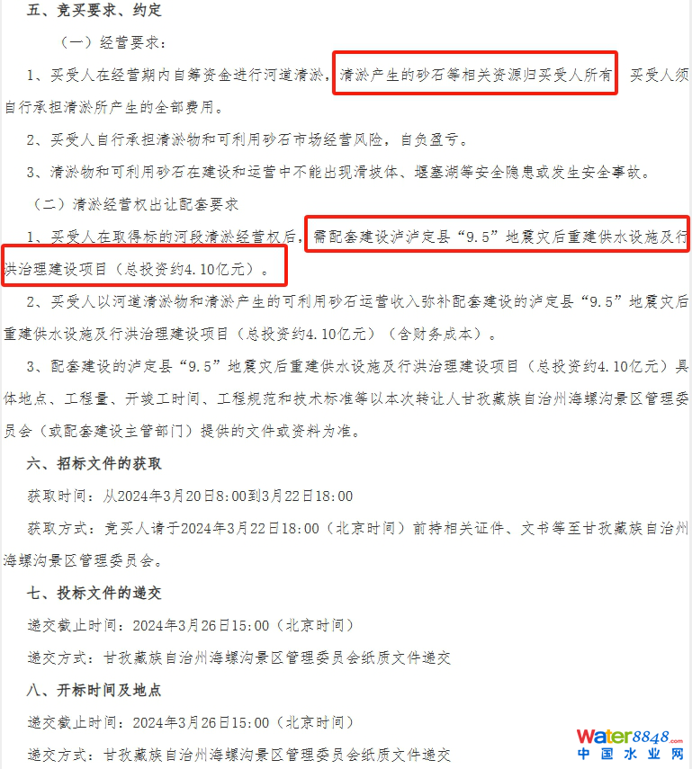 雅家埂河大木干溝口至海子凼段長約7公里,其中3.86公里河道位于采砂規(guī)劃的禁采區(qū)。2024年3月,海螺溝景區(qū)管理委員會(以下簡稱海螺溝管委會)以河道綜合整治為由,一次性出讓上述河道清淤疏浚采砂經(jīng)營權(quán)18年,涉及砂石量460萬立方米。同時,海螺溝管委會未將疏浚砂綜合利用收入繳入國庫,而是約定歸買受人所有,由買受人出資配套建設(shè)瀘定縣“9·5”地震災(zāi)后重建供水設(shè)施及行洪治理建設(shè)項目。