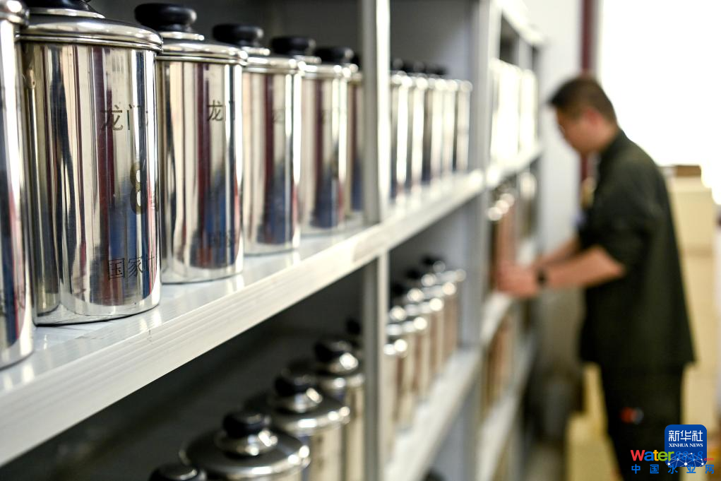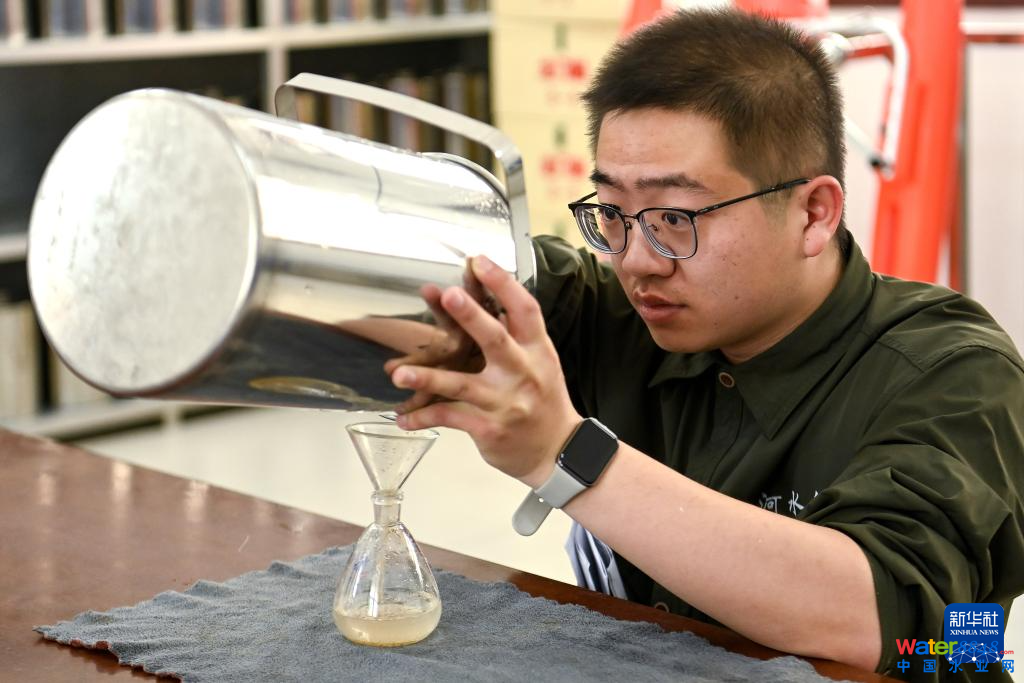 4月28日,龍門水文站水情組副組長霍鳴沖在整理取樣筒。
