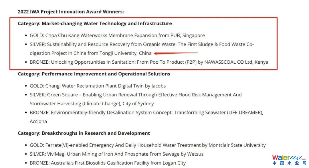 在近日于丹麥哥本哈根舉行的2022年國際水協(xié)會(International Water Association,IWA)世界水大會暨展覽會上,IWA項目創(chuàng)新獎(Project Innovation Awards,PIA)頒授,由同濟大學環(huán)境科學與工程學院戴曉虎教授團隊牽頭,同濟大學、上海市政工程設計研究總院、鎮(zhèn)江市水業(yè)有限責任公司、上海同濟普蘭德生物質能股份有限公司、德國布倫瑞克工業(yè)大學聯合完成的項目“基于協(xié)同厭氧消化的市政污泥與餐廚垃圾等有機廢棄物可持續(xù)資源利用處理技術及模式”斬獲國際銀獎。此次項目創(chuàng)新獎設有6個類別,每個類別設金銀銅獎各一名。全球共有18個項目獲獎,中國有2個項目獲銀獎。