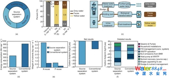 DWS 的建設(shè)為污水源頭分離奠定了基礎(chǔ)。源分離需要多領(lǐng)域與部門(mén)配合,可促進(jìn)能源回收、水處理及廢物利用等領(lǐng)域合作。通過(guò)分析灰水、黃水以及糞便的體積、總氮(TN)和總磷(TP)分布,能發(fā)現(xiàn)源分離具有極大的資源回收潛力;宜倮每尚纬稍偕,黃水與糞便回收可用于肥料生產(chǎn)。相較于傳統(tǒng)集中式水系統(tǒng),源分離簡(jiǎn)化了水質(zhì)復(fù)雜性,降低了后續(xù)水處理的能耗和碳排放,同時(shí)促進(jìn)了水中氮、磷資源的回收。