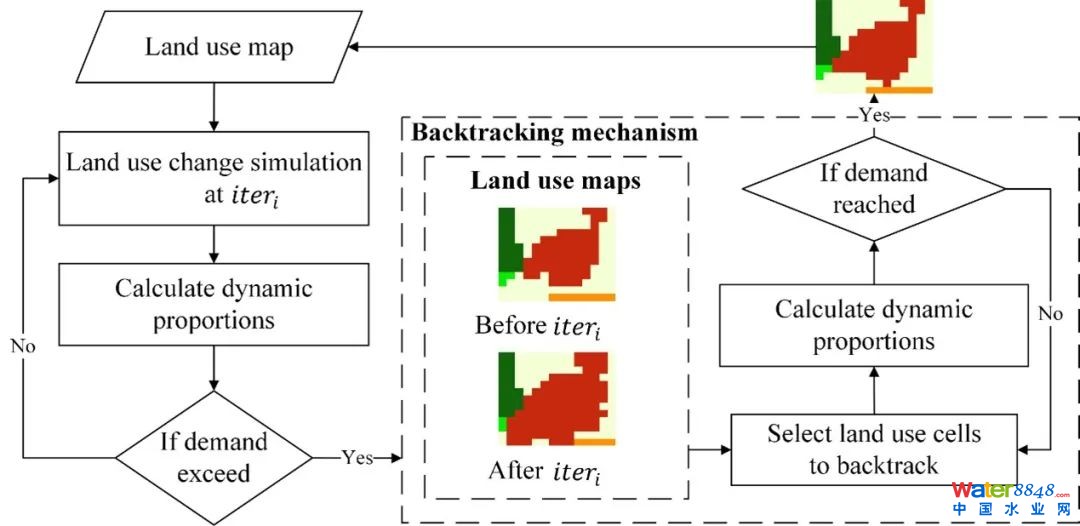 除此之外,框架中還為該模塊提出了一種回溯機(jī)制,以確保土地利用的變化能夠受到全局需求的限制。每次迭代后,都能夠計(jì)算每種土地利用類(lèi)型的比例,以確定是否超出土地利用需求。如果在迭代i中超過(guò)了k類(lèi)型的需求,則將回溯該迭代中的土地利用變化。如圖4所示,一些元胞的土地利用類(lèi)型被選擇回溯,而另一些元胞則在迭代i后保留土地利用類(lèi)型。在回溯后,進(jìn)一步比較土地利用類(lèi)型的比例和需求以保證剛剛達(dá)到土地使用需求且不會(huì)超出。