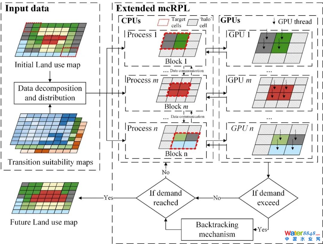 本研究提出了一種基于混合并行計(jì)算架構(gòu)的并行框架,用于開(kāi)發(fā)面向地理柵格的并行Geo-CA模型。該框架的設(shè)計(jì)考慮了Geo-CA模型的發(fā)展趨勢(shì),確保其適用于廣泛的Geo-CA模型,尤其是現(xiàn)代和廣泛使用的模型。在轉(zhuǎn)換規(guī)則挖掘和土地利用變化模擬中,混合計(jì)算架構(gòu)與各種并行工具被用于并行化理論上多樣且計(jì)算密集的程序。此外,研究中提出了一種回溯機(jī)制,通過(guò)混合計(jì)算架構(gòu)上的土地利用需求,有效約束土地利用變化。與提出框架的工作流程部分或完全相似的Geo-CA模型都可以使用該框架進(jìn)行并行化。