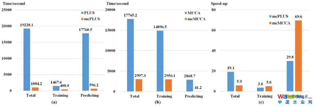 對(duì)于土地利用轉(zhuǎn)換規(guī)則挖掘部分,研究中對(duì)比了并行版本與普通版本模型的計(jì)算時(shí)間。實(shí)驗(yàn)結(jié)果表明(圖5),研究中提出的框架能夠提高土地利用轉(zhuǎn)換規(guī)則挖掘部分的計(jì)算效率。在并行過(guò)后,mcPLUS和mcMCCA分別比PLUS和MCCA快19.1倍和5.9倍。