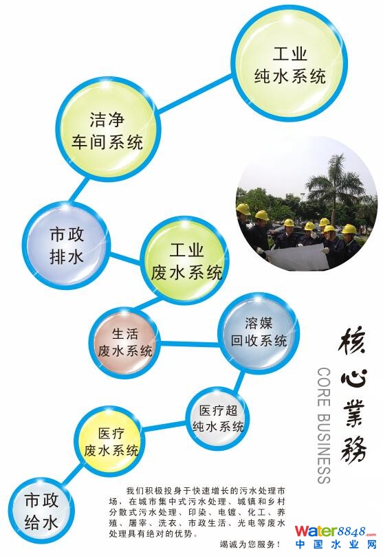 目前 ,公司主營業(yè)務(wù)含水務(wù)投 資建設(shè)運營 、PPP BT 、BOT 、EP C 、城市供水 、排水 、一  體化污水成套裝備制造 、工業(yè)園區(qū)污水處理 、河道 、湖泊 、水體治理 、土壤修復(fù) 、礦山治理、 農(nóng)田復(fù)墾 。依托節(jié)能環(huán)保綜合服務(wù) ,包括設(shè)計與規(guī)劃咨詢 、建造與工程總承包 、產(chǎn)融結(jié)合,打造節(jié)能環(huán)保 “ 全產(chǎn)業(yè)鏈 ”,為客戶提供整體解決方案和系統(tǒng)化服務(wù) ,成為節(jié)能環(huán)保領(lǐng)域具有競爭力的科技型服務(wù)型產(chǎn)業(yè)公司。