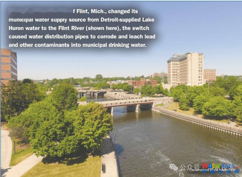 圖 當弗林特市將他的市政供水水源從底特律買水改為從弗林特河取水,水源的切換導致了弗林特市的輸配水管道的腐蝕和鉛泄露,這些污染直接進入了市政飲用水中。