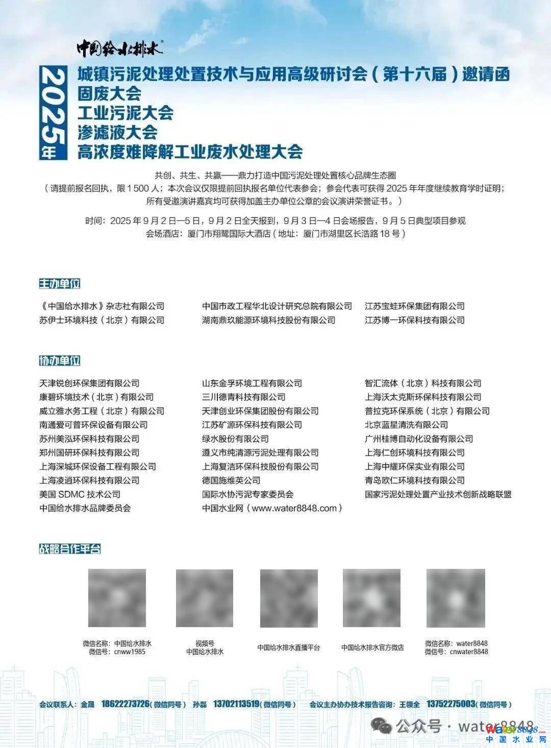 中國給水排水2025年城鎮(zhèn)污泥處理處置技術與應用高級研討會(第十六屆)邀請函暨征稿啟事 (同期召開固廢大會、工業(yè)污泥大會、滲濾液大會、高濃度難降解工業(yè)廢水處理大會)