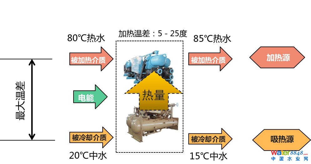 水源熱泵是一種以中水為低溫?zé)嵩,借助壓縮機(jī)及其中制冷劑(冷媒)的相變,通過消耗少量電能,實(shí)現(xiàn)對外供熱的成套設(shè)備,主要由壓縮機(jī)、蒸發(fā)器、冷凝器、節(jié)流裝置等部件組成。