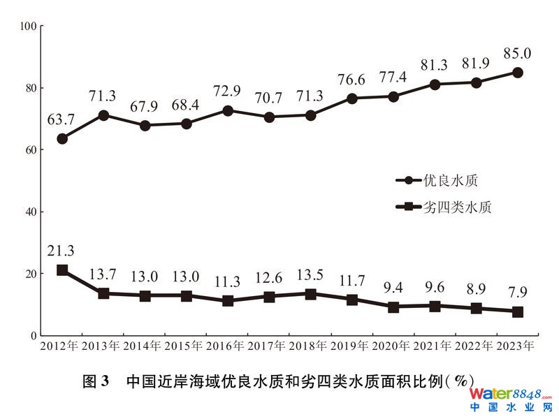 通過(guò)深入推進(jìn)重點(diǎn)海域綜合治理、陸海污染協(xié)同防治,持續(xù)建設(shè)美麗海灣,中國(guó)近岸海域水質(zhì)總體改善,2023年優(yōu)良水質(zhì)面積比例較2012年高出21.3個(gè)百分點(diǎn)。