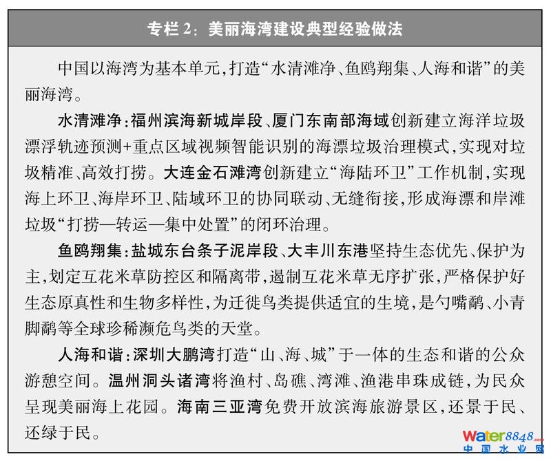 全面部署美麗海灣建設(shè)。《中華人民共和國(guó)國(guó)民經(jīng)濟(jì)和社會(huì)發(fā)展第十四個(gè)五年規(guī)劃和2035年遠(yuǎn)景目標(biāo)綱要》明確要求推進(jìn)美麗海灣保護(hù)與建設(shè),《關(guān)于全面推進(jìn)美麗中國(guó)建設(shè)的意見(jiàn)》將美麗海灣納入美麗中國(guó)建設(shè)全局,明確要求到2027年美麗海灣建成率達(dá)到40%左右,到2035年美麗海灣基本建成!“十四五”海洋生態(tài)環(huán)境保護(hù)規(guī)劃》聚焦美麗海灣建設(shè)主線,把近岸海域劃分為283個(gè)海灣建設(shè)單元,將重點(diǎn)任務(wù)措施和目標(biāo)逐一落實(shí)到各個(gè)海灣!睹利惡辰ㄔO(shè)提升行動(dòng)方案》進(jìn)一步明確,到2027年重點(diǎn)推進(jìn)110余個(gè)美麗海灣建設(shè)。目前,美麗海灣建設(shè)工作穩(wěn)步推進(jìn),截至2023年底,1682項(xiàng)重點(diǎn)任務(wù)和工程措施完成近半,累計(jì)整治修復(fù)岸線475千米、濱海濕地1.67萬(wàn)公頃,167個(gè)海灣優(yōu)良水質(zhì)面積比例超過(guò)85%,102個(gè)海灣優(yōu)良水質(zhì)面積比例較2022年有所提升。