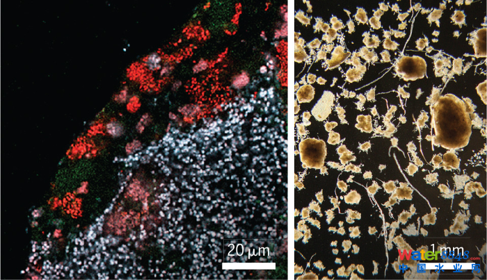 好氧顆粒污泥系統(tǒng)的切片顆粒(左)包括硝化菌(紅色)和反硝化聚磷酸鹽蓄積生物(PAO)(藍色)。顆粒來自連續(xù)流動系統(tǒng)(右)。