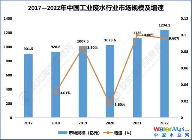 2017—2022年中國工業(yè)廢水行業(yè)市場規(guī)模及增速